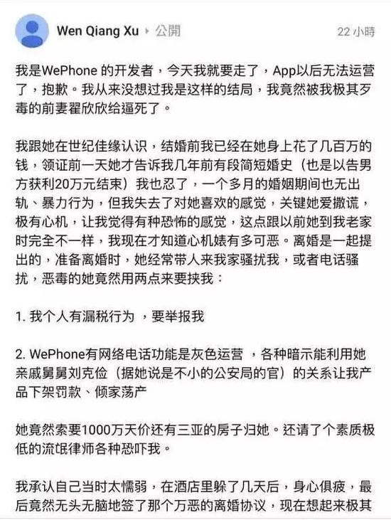 早先,手机应用开发者苏享茂因被前妻翟欣欣所逼,遭索要 1000 万元和房产补偿,后自杀身亡。