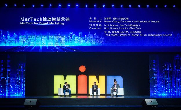 腾讯公司副总裁郑香霖,MarTech概念创始人Scott Brinker,腾讯AI Lab主任及杰出科学家张潼在峰会现场进行对话