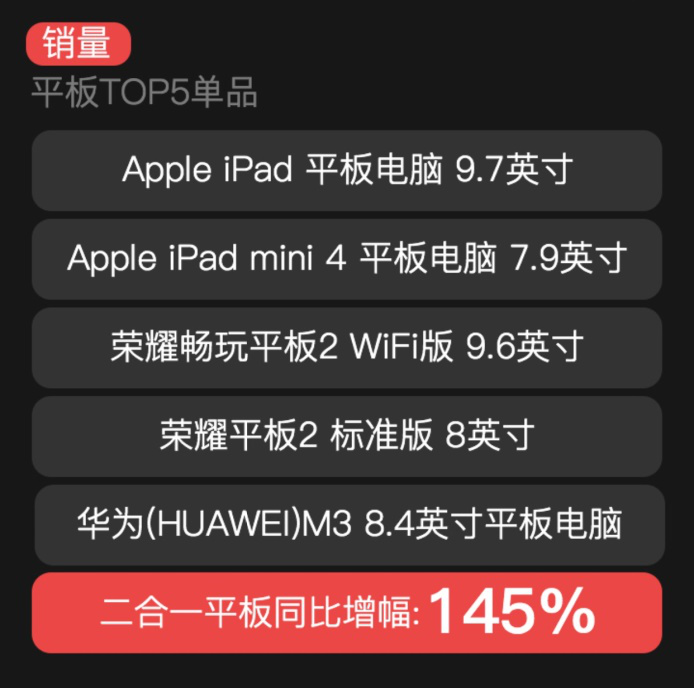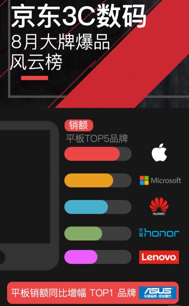 9 月 8 日,备受关注的京东3C数码 8 月大牌爆品风云榜火热出炉,从京东官方公布的多项数据看,3C数码品类较以往比拟新增了不少看点。各大品牌纷纷瞄准“开学季”这一购买热潮,抓住年轻化消费需求痛点,携重量级产品重拳出击。在最受关注的平板电脑TOP5 单品排行榜中,除了苹果、荣耀、华为三大品牌位居行业“火车头”,二合一平板表示颇为亮眼,以同比增幅145%的销量成为行业翘楚,也正挤占着条记本的销售空间。