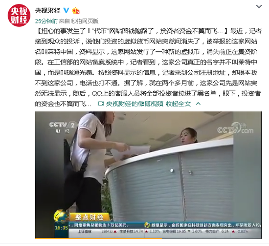 比来,记者接到不雅观众的投诉,说他们投资的虚拟货币网站突然间消失了,被举报的这家网站名叫莱特中国,资料显示,,这家网站发行了一种新的虚拟币,消失前正在集资阶段。在工信部的网站存案系统中,记者看到,这家公司真正的名字并不叫莱特中国,而是叫瑞通光泰。根据资料显示的信息,记者来到公司注册地址,却根本找不到这家公司,电话也打欠亨。据了解,就在两个多月前,这家公司先是网站突然无法显示,随后,QQ上的客服人员将全部投资者拉进了黑名单,眼下,投资者的资金也不翼而飞…
