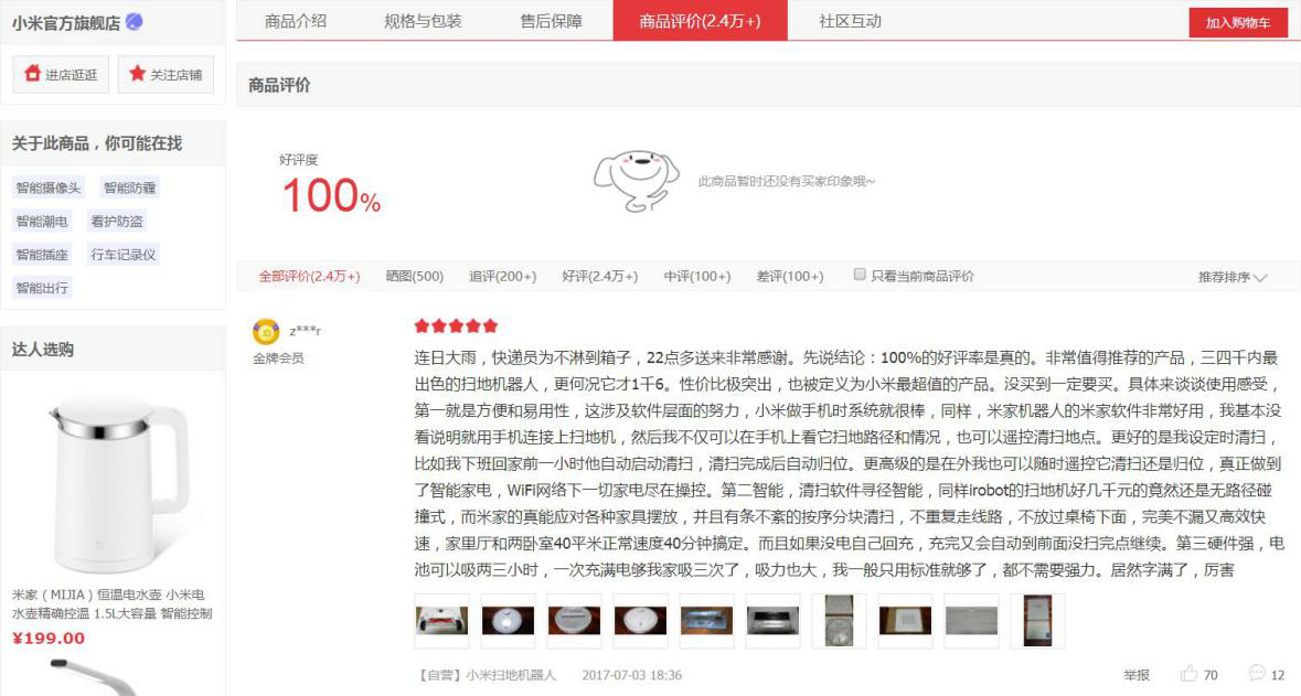 事实上,米家扫地机器人在过去一年里获得了广泛的优质反馈。从 2016 年 8 月起,石头科技与米家携手发布米家扫地机器人,短短一年时间,米家扫地机器人在天猫、京东双平台的销售额均已达到第一,同时,京东平台上用户好评超 2 万条,好评率更是达到难得的100%。