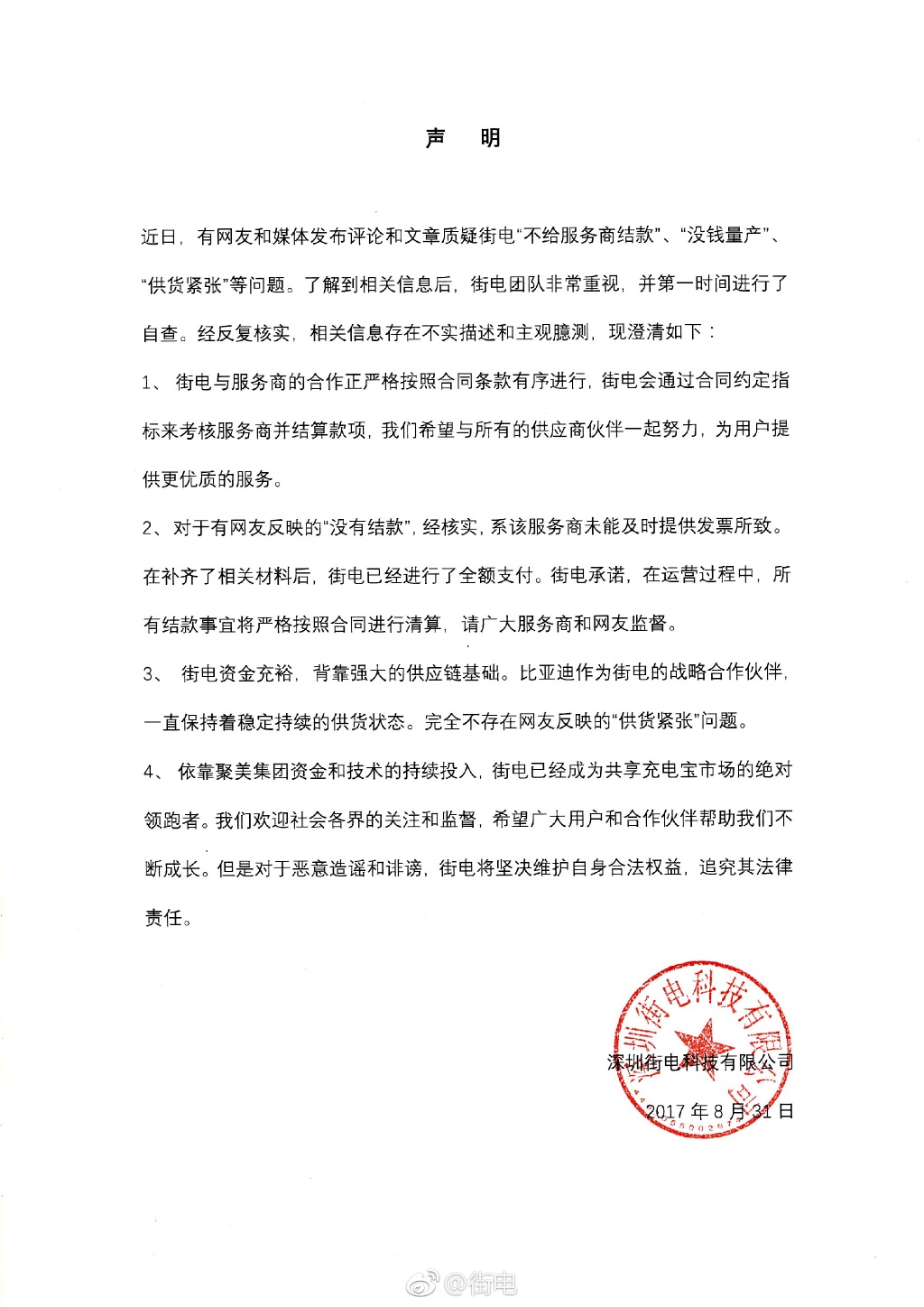 街电体现,网友反映的“不给办事商结款”系该办事商未能及时提供发票所致,在补齐材料后,街电已经全额支付。而在资金方面,官方称,街电资金充裕,依靠聚美集团资金和技术的继续投入,已经成为共享充电宝市场绝对的领跑者。