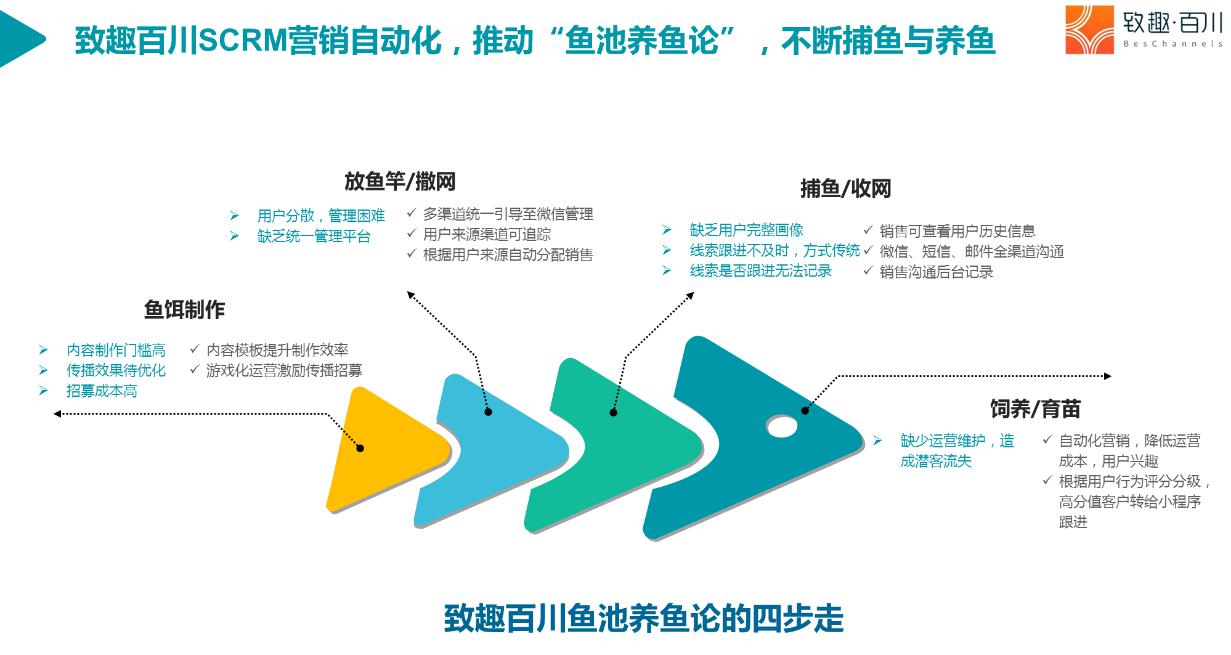 这次致趣百川(北京致趣科技有限公司)能脱颖而出,与其强劲的技术配景、对市场的驾驭能力以及坚持不懈的努力分不开。致趣百川认为企业不但要网鱼,也要学会养鱼:把客户比方为一条条游动的鱼。营销需要全渠道网鱼,获取客户,大鱼在营销闭环中直接出池,小鱼则留在鱼池,完成用户的成长。通过营销自动化,完成用户打分,评估是否可以出池;对于还未长成的小鱼,不停提供营养,实现销售加速;而作为支撑的行为解构,则可以不停了解鱼的情况,及时做出池或者加速的准备。