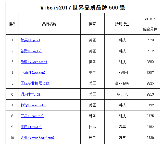 其中, 2017 世界国际品质品牌 500 强榜单的前 10 名如下: