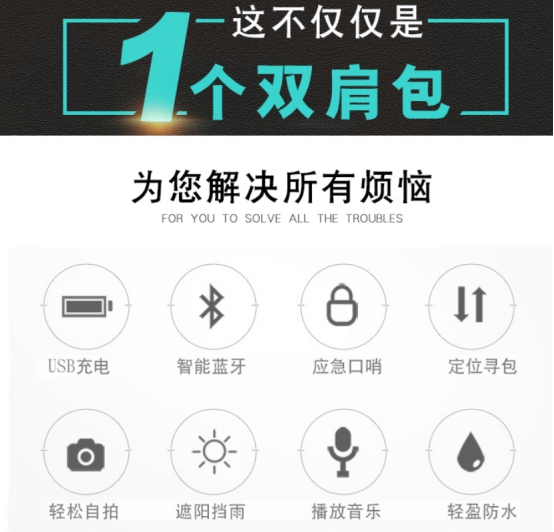 智能背包伞伞柄内置两个音箱,播放音乐时,声音刚好环绕在耳朵周围,盘旋于伞顶中具有环绕立体声的效果,可以在旅途中也可尽情享受音乐的乐趣;可以通过蓝牙与手机连接,便利接听电话,也可以播罢休机自带音乐,还可以播放已下载到TF卡中音乐;具有音响和耳机自由切换的功能。背部隐藏口袋,可放置移动电源,钱包、护照手机等随身物品,轻松存取,安适便捷,连接电源外充接口 无需打开背包,即可轻松充电。