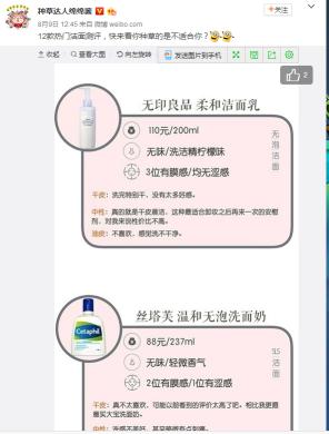 有网友爆料称,有着 1000 万多粉丝的微博大V@种草达人绵绵酱,在 8 月 9 日颁发了一篇点赞数过千的微文《 12 款热门洁面测评,快来看你种草的是不适合你》,严重抄袭网易美学平台上的一篇原创的PGC评测文章《 5 大肤质实测 12 款热门洁面,性价比王花落谁家? 》。网易美学作为一个专注于发现和分享的护肤美妆平台,自上线以来便将重心放在提供高价值产品和信息上,生产了不少优质内容。网易美学平台上的 PGC内容被引用借鉴的情况时有发生,但这篇文章竟然从标题抄到内容,从图片抄到数据,甚至连版式也相差无几,让人叹服。
