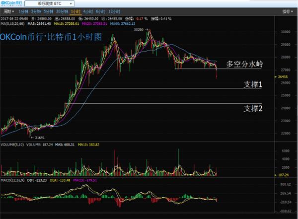 按照国内知名的数字资产交易平台OKCoin币行的数据显示,比特币昨天( 8 月 21 日)价格呈弱势震荡格局,虽然在亚市下午盘出现了短暂回升,但未能扭转整体偏弱的走势格局,收盘以阴线报收,收于 27320 一线。截止今日发稿前,价格再次下探创出近日新低,最新交投于 26350 附近。
