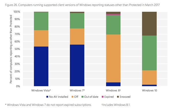 从陈诉来看,,Windows Vista和Windows7 都有超过50%的电脑未安置任何防病毒软件,还有一大部分人直接把杀毒软件关了,别的一大部分人的杀毒软件已经过期(未更新)。