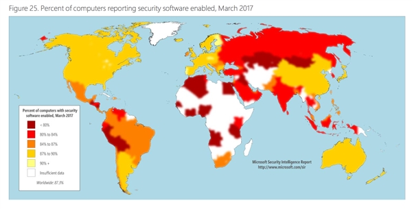 如果以国家和地区来看,欧洲受到安适软件掩护的Windows电脑占比最高,其中芬兰高达92%,而俄罗斯、蒙古以及非洲、拉美一些国家则是重灾区。