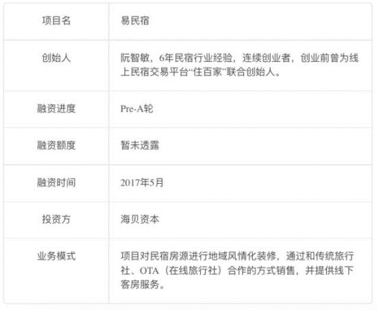 抱着这个想法,本年2月,阮智敏创立易民宿。项目对民宿房源进行地域风情扮装修,通过和传统旅行社、OTA(在线旅行社)合作的方式销售,并提供入房引领、Wi-Fi调试等线下客房办事。