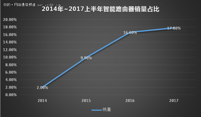 数据显示, 2017 年上半年家用路由器整体销量占比近17.8%,较 2016 上半年销量增长1.2%,增长明显;较 2015 上半年销量增长7.9%;较 2014 上半年销量增长15.8%,连续四年连结高速增长状态,只能路由器市场连结了良好的增长势头,并加速向纵深发展,产品更新换代速度也不停加快。
