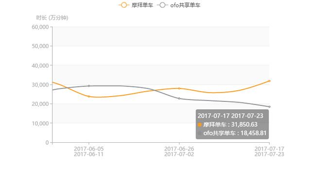 6 月 5 日至 11 日~ 7 月 17 日至 23 日,摩拜单车周使用时长双月走势从 23819 万分钟增长至 31851 万分钟,增幅为34%,ofo小黄车从 29241 万分钟下滑至 18459 万分钟,降幅为37%。