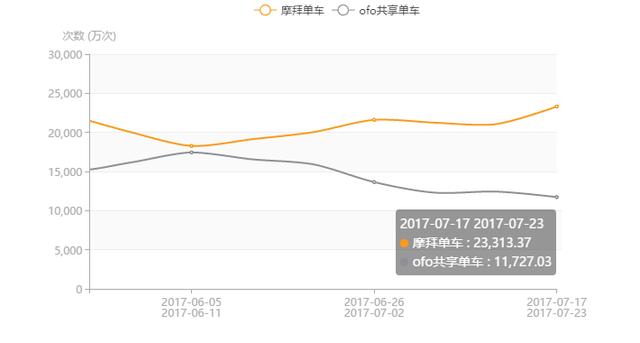 6 月 5 日至 11 日~ 7 月 17 日至 23 日,摩拜单车周使用次数双月走势从 18269 万次增长至 23313 万次,增幅为28%,ofo小黄车从 17443 万次下滑至 11727 万次,降幅为33%。