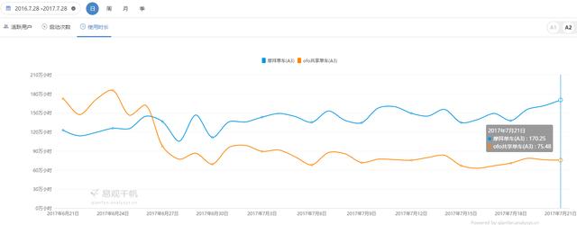 6 月 21 日~ 7 月 21 日,摩拜APP日使用时长从 123 万小时增长至 170 万小时,增幅为38%,ofo从 172 万小时下滑至 75 万小时,降幅为56%。