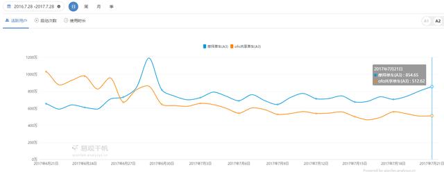 回顾易不雅观千帆数据,其中 6 月 21 日~ 7 月 21 日,摩拜单车日活跃用户量单月走势从 653 万增长至 855 万,增幅为31%,ofo小黄车从 1031 万下滑至 513 万,降幅为50%。