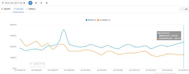 6 月 21 日~ 7 月 21 日,摩拜单车APP日启动次数单月走势从 1863 万增长至 2411 万,增幅为29%,ofo小黄车从 2666 万下滑至 1281 万,降幅为52%。