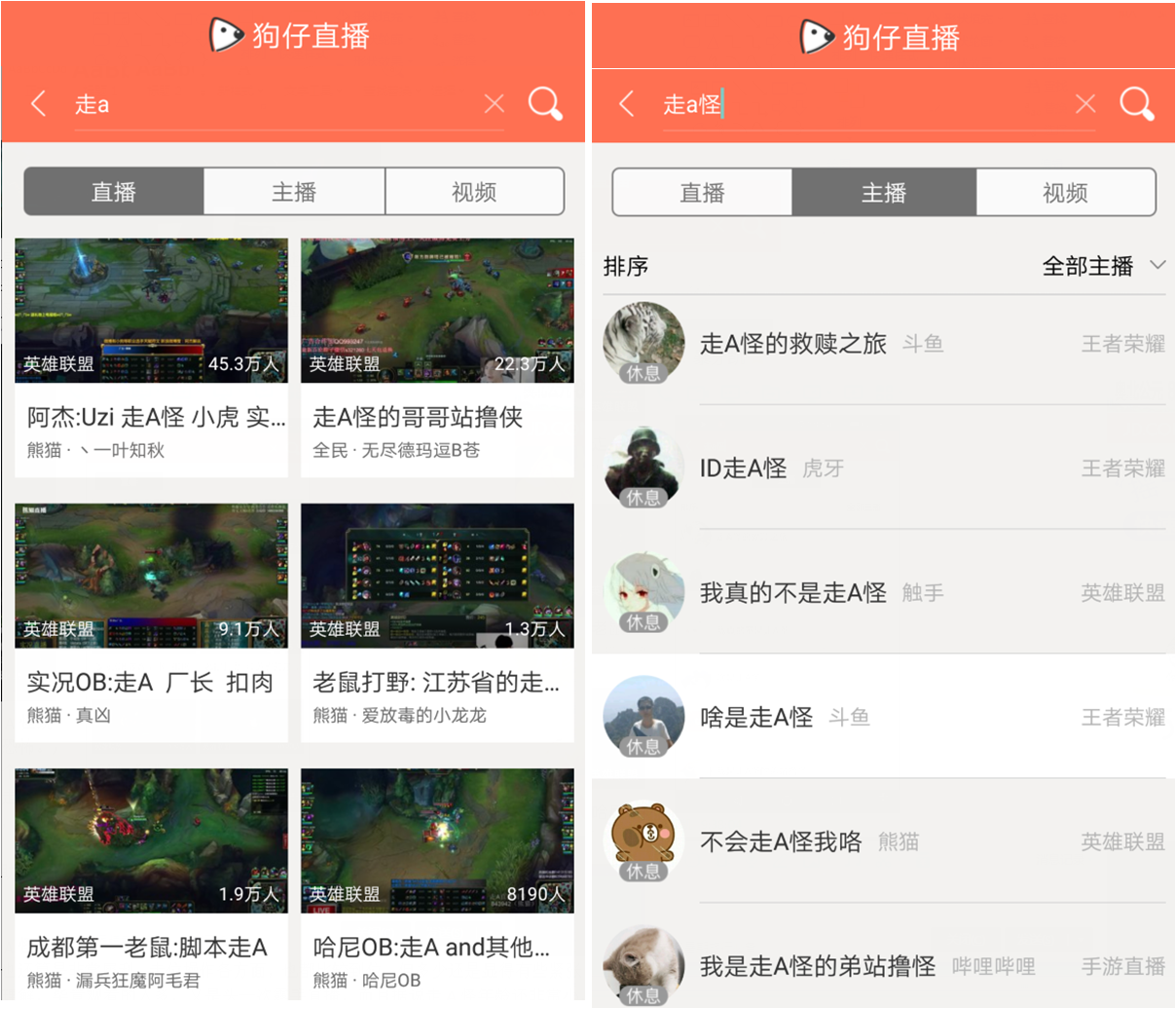 至于走A怪现在火到什么程度,前两天走A怪去某个平台进行了直播,不雅观众人数爆表,数字比较恐怖。从别的一个角度也能看出来:在狗仔直播APP上( 1 款聚合型直播助手,通过这个APP可以不雅观看所有平台的直播)随便什么时间,搜索一下走A,或者走A怪,你就会发现不管是主播,还是直播的内容,有很多都在和走A怪沾边,好比下面的两张图,就可以很清晰看到