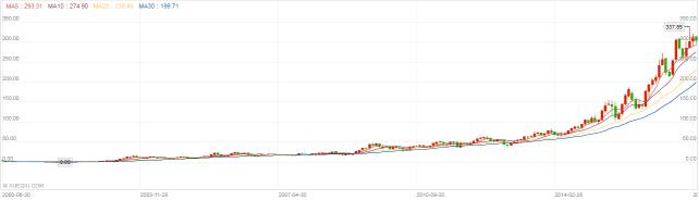 事实上,从 2000 年 6 月在美国纳斯达克股票市场上市开始,网易股价一直处于上涨通道,在比来三年多的时间里,更是走出了一条几乎完美的上扬曲线,股价攀升到 300 美元以上,市值一度超 400 亿美元,在 17 年来,股价暴涨了 2600 倍,成为了当之无愧的“中概股第一牛股”。