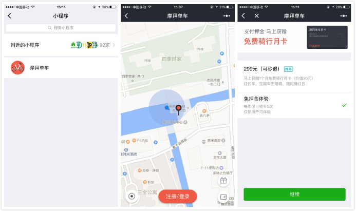 用户通过微信小程序端注册成为摩拜新用户,既可以通过摩拜单车APP用车,也可以直接打开微信、通过“扫一扫”功能扫码解锁,体验便利快捷的共享出行办事,每周享受 5 次免押金骑行。此外,新用户在缴纳押金后,即可获赠免费月卡 1 张, 30 天内不限次数免费畅骑。