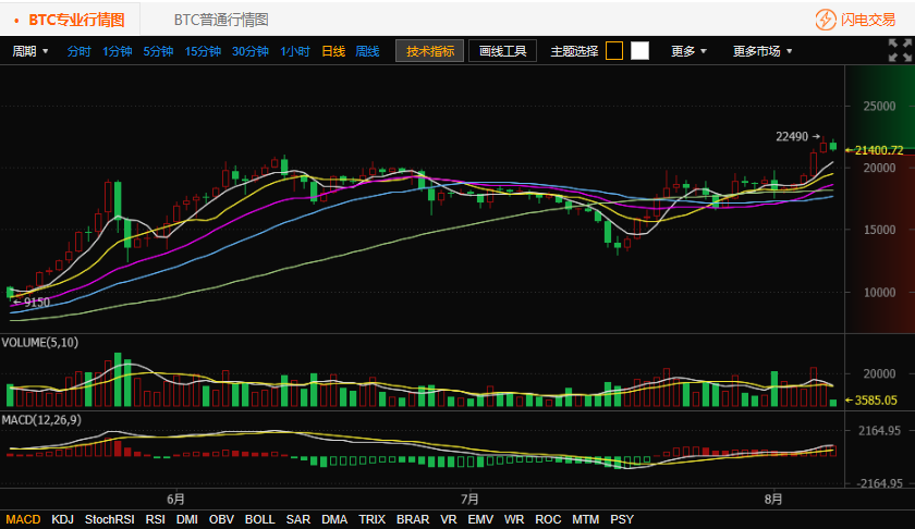 按照比特币交易平台火币网行情显示,截至北京时间 8 月 7 日 10 点,比特币价格为21365. 09 元人民币。火币网比特币今日开盘价格为 21959 元,目前最高价格为22299. 99 元,最低价格为 21258 元,跌幅2.7%。