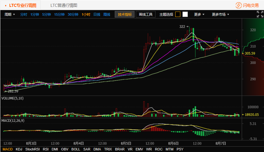 按照莱特币交易平台火币网行情显示,截至北京时间 8 月 7 日 10 点,莱特币价格为305. 59 元人民币。火币网莱特币今日开盘价格为312. 7 元,目前最高价格为 314 元,最低价格为 304 元,跌幅2.27%。