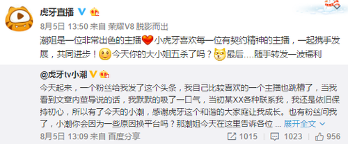 继嗨氏还董小飒之后,张大仙更换平台后的火爆首秀也迎来了虎牙平台众主播的集体“高潮”。如果说最开始的董小飒是虎牙官方授意发微博嘲讽的话,那后续各主播的所谓“表忠心”微博,便是虎牙内部有计划的蹭热抹黑了吧。