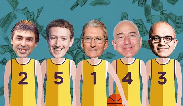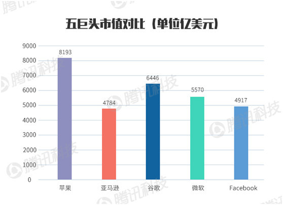 上图为八月二日网络上发布的五巨头市值数据,从图中可以看出,苹果和谷歌依然具有领先优势。值得注意的是,即将步入 5000 亿美元俱乐部的Facebook,由于亚马逊股价在其财报发布后下跌,成为美国市值第四高的科技公司。