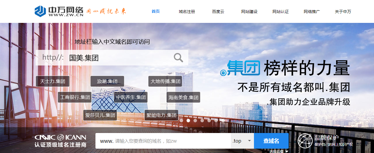 作为长期办事政务机构的注册商,积极响应国家政策的排头兵,启用中文域名不但仅是对中文域名的认可,更是对国家网络正常的支持。 2017 年 7 月份,,中万网络正式启用“中万.集团”域名,承担与目前主域名的同等功能,向客户展示出“.集团”域名应有的魅力。