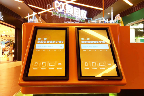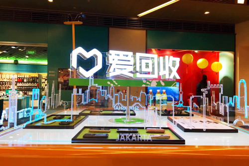别的,爱回收嘉里中心环保办事站还放设计了以亚克力为原材料勾勒出的大城市轮廓,并将有代表性的经典废旧手机放置其中,它象征着在一线城市快节奏的生活影响下,被快速淘汰的大量废旧电子产品。爱回收希望通过该装置唤醒用户对于环境污染的关注。与此同时,爱回收还将该店面内的触摸询价机调低后倾斜放置,增加嘉里城众多儿童客群与爱回收之间的互动机会。