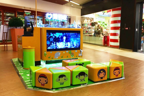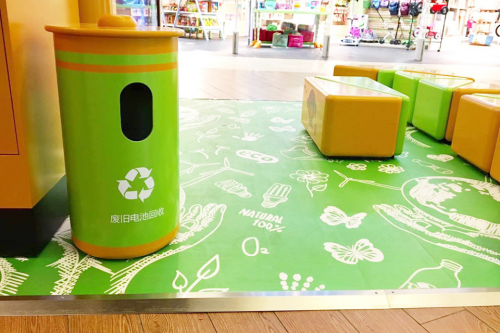 爱回收嘉里中心全新升级的环保办事站抛开固有“数码产品回收”的印象,从社会责任与品牌形象的角度展示爱回收的办事与理念。为了增加与儿童之间的互动体验,爱回收将店面近三分之一的区域设计为休息区,采用积木设计的卡通风儿童座椅和垫子,并配以电视荧幕播放儿童喜爱的节目。爱回收一方面希望孩子可以在商场内拥有一个固定的休闲区域,也喜欢借由孩子休闲娱乐的同时,通过绿色电池回收桶引导儿童回收废旧电池,从小培养环保意识。