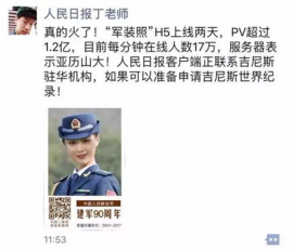 根据工信部公布的我国移动互联网有11.2亿用户来算,每30个人里就有一个人在这个H5产品里“试穿军装”,“试穿”之后分享到伴侣圈和其他好友组群的总数达到了711万。人民日报已经打算为它申请个吉尼斯世界纪录了。