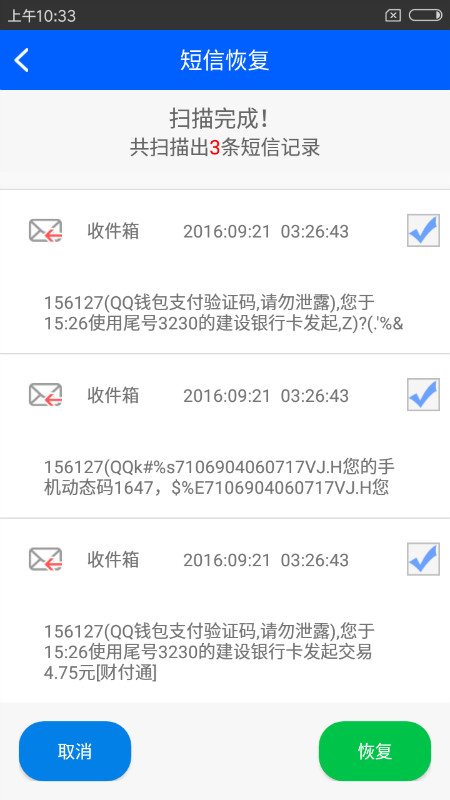 步骤五:查看完短信内容之后,请将需要恢复的短信进行勾选,点击“恢复”按钮就可将删除的短信恢复。