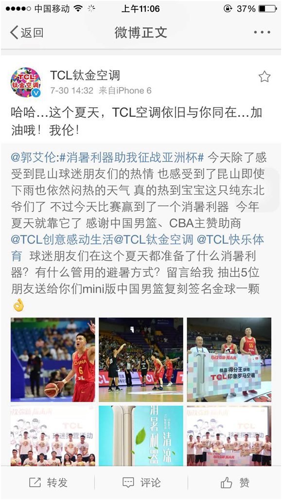 记者注意到,TCL赞助中国男篮的基础在于双方对突破、拼搏精神的共同追求,而另一方面,篮球运动激情、富于乐趣的体验也与TCL品牌“年轻化”的理念更为契合。