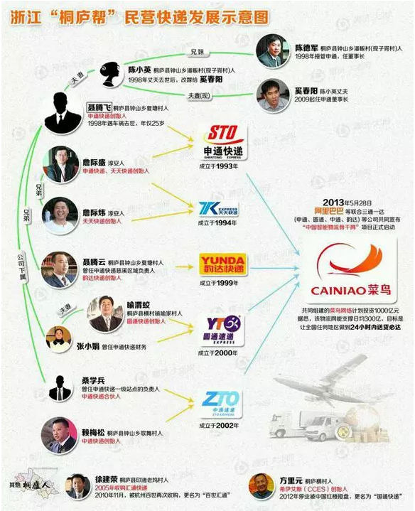 盛传颇广的故事是,聂腾飞、詹际盛在 1993 年双双从工厂辞工,创办了后来的“申通快递”,成为国内第一家民营特许加盟的快递企业。风云际会,沧海横流,在复杂的人际关系和创业出走的浪潮中,申通、圆通、韵达、中通、汇通、天天快递,以及已经更名为国通的CCES,背后都不乏桐庐籍企业家的身影,桐庐帮占领了中国快递业的豆剖瓜分。