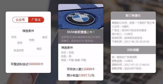 如果您是公众号主--->点击菜单“公众号”,完成授权后,待系统大数据分析后,将收到合适的广告接单提醒如果您是广告主--->点击菜单“广告主”,按标签筛选符合需求的在线粉丝,编纂广告内容,付费投放送达