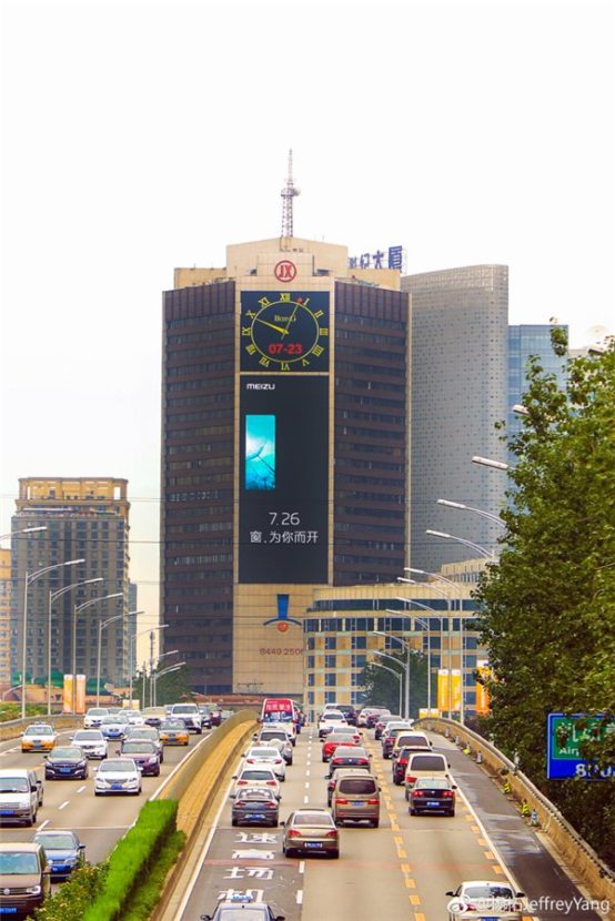 不在北京的伴侣也许对于京信大厦并没有什么概念。京信大厦因为位置的独特性(位于东三环北三环连接处,外立面朝南正对东三环)及自身109米的高度优势,在由南向北的东三环行车时,从5公里以外即可看到位于路正中尽头处的京信大厦。而京信大厦在外墙上近千平方米的纵向巨幅广告位无疑也成了京城中最抢眼的风景之一。并且因为地处多国使馆区附近,同时连接首都机场高速,被誉为“亚洲第一屏”及“国门第一屏”,名号仅次于“世界第一屏”纽约时代广场大屏。而距离魅族PRO 7发布越来越近,魅族PRO 7的广告也在7月24日在京信大厦这个京城地标上亮起。