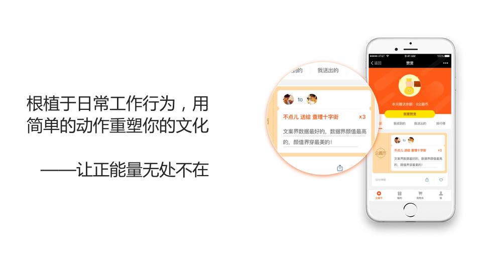 员工互相赠送企趣币的同时,有理由、有点赞、有评价,建立横向评价体系,激发员工的成就感和工作的积极性,促进团队协作。企趣币不但是物质奖励,更多的是精神方面的认可与激励。