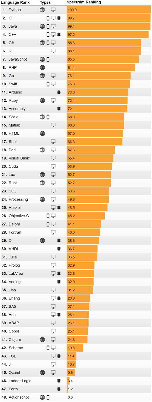 以下是 IEEE Spectrum 给出的编程语言排行完整榜单: