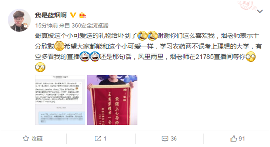 虽然是一份令人“哭笑不得”的礼物,蓝烟还是在收到礼物之后发博体现必然会在直播间等他回来看直播,也对这位学霸粉丝大嘉赞赏,作为“老师”的蓝烟很是欣慰,并鼓励其他粉丝向这位粉丝学习,也要做到学习农药两不误!