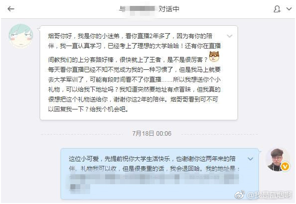 从蓝烟微博晒出的私信对话截图来看,本来是一位刚考上抱负大学的忠实烟粉,即将踏入大学生活的他,可能有一段时间不能看烟老师直播,因此为本身所爱的烟老师送上了一份“大礼”,以此感谢蓝烟在游戏生活中对他的帮手,,不但教他上王者,也督促他考上抱负大学,实实在在的做到了游戏生活两不误!