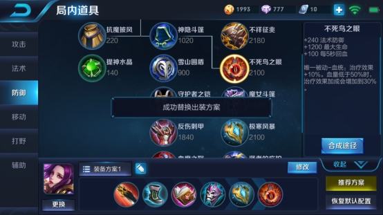 出装上,蓝烟的选择是:贪婪之噬、抵抗之靴、噬神之书、痛苦面具、极北风暴、不死鸟之眼。
