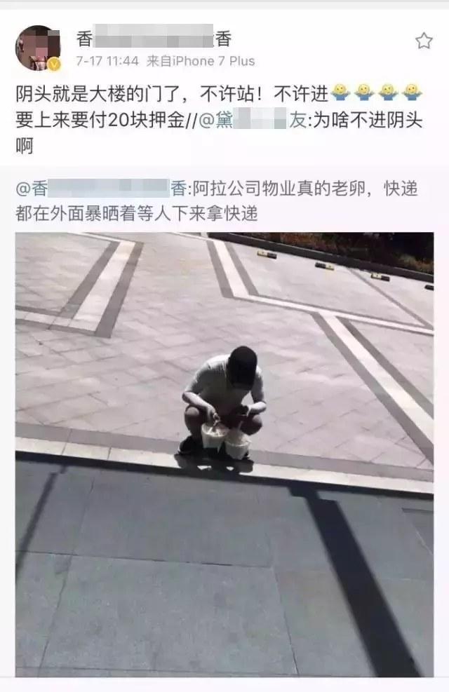 据悉,当时室外的温度是 40 度,其灼热程度可想而知。而由于大楼物业规定外卖不能进门不能站门口,上来就要交 20 元押金!外卖小哥只好蹲在外面等候。