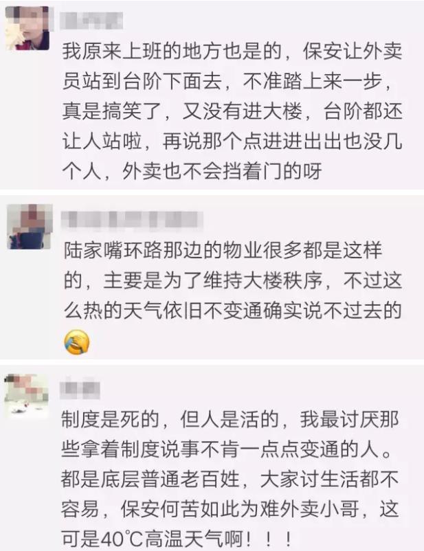 对此,不少网友认为物业这样做太没人性,称他们的冷漠和高温形成了鲜明的对比。规定是死的,人是活的,你哪怕给他一把遮阳伞也好啊~