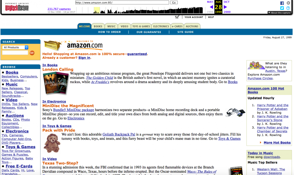 到 1999 年,也就是 Amazon 上线 4 年后,亚马逊的官网上早已不再局限于“卖书”了,业务扩展到了音乐、视频、电子产品等。