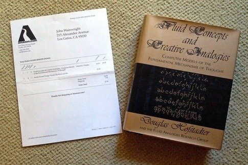 图片中是亚马逊的“第一单”。亚马逊卖出的第一本书是Douglas Hofstader的《Fluid Concepts and Creative Analogies: Computer Models of the Fundamental Mechanisms of Thought》,买这本书的是一名电脑学家:Jon Wainwright。