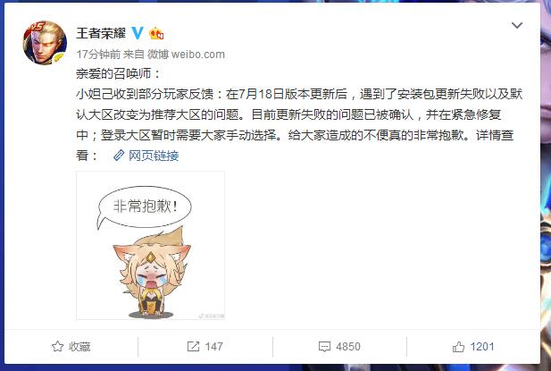 官方作出回应称,在 7 月 18 日版本更新后,遇到了安置包更新失败以及默认大区改变为保举大区的问题。目前更新失败的问题已被确认,并在紧急修复中;登录大区暂时需要大家手动选择。