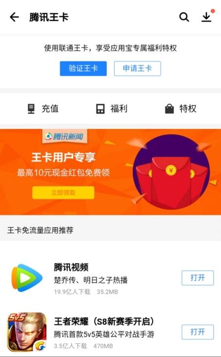 不只是使用和下载免流量,应用宝的腾讯王卡专区还专门为王卡用户牟取了独家福利,“福利社”专区内,已经正在陆续接入腾讯视频会员、NOW直播红包、QQ阅读红包、王者荣耀大礼包等诸多福利。日前上线的腾讯新闻专享红包活动,王卡新用户可拿到高达 10 元的现金红包。