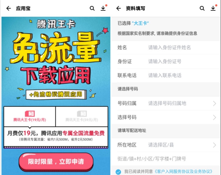 聚合了所有王卡免流量应用及福利的应用宝“腾讯王卡”专区,堪称是大王卡的免流应用“门户网站”。这个“门户网站”也提供了王卡的申请入口,用户可以在这里轻松购买腾讯王卡。