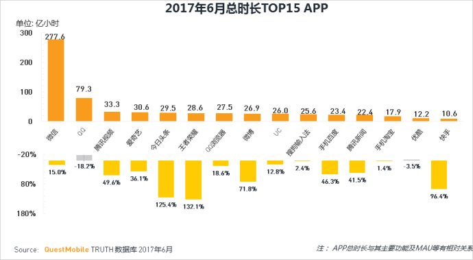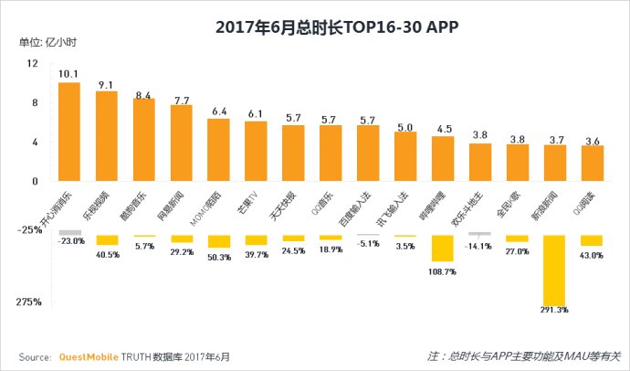 此外,陈诉还分析了 2017 年 6 月份总时长APP使用排名,微信、QQ别离位居第一第二名。王者荣耀,今日头条,快手,哔哩哔哩及新浪新闻的总时长同比增长亮眼,以下是 6 月总时长TOP30APP