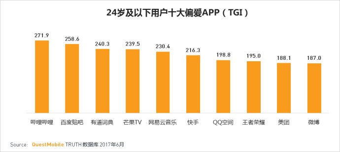数据显示, 6 月份最受 24 岁及以下年轻用户偏爱的十大APP别离是:哔哩哔哩,百度贴吧,有道词典,芒果TV,网易云音乐,快手,QQ空间,王者荣耀,美团,微博。
